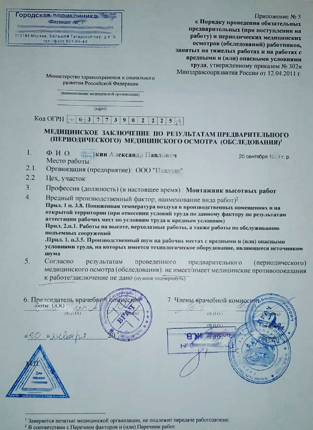 Для прохождения комиссии необходимо посетить терапевта, психиатра, невропатолога, отоларинголога, хирурга, офтальмолога и гинеколога (только для женщин). Кроме то профильных специалистов, в бланке требуется заключение о прохождении ЭКГ, ОАК, ОАМ. По результатам обследований и консультаций выносится заключение, что пациент здоров и допускается к высотным и верхолазным работам с использованием средств и мер безопасности. Подобная медсправка обычно требуется: